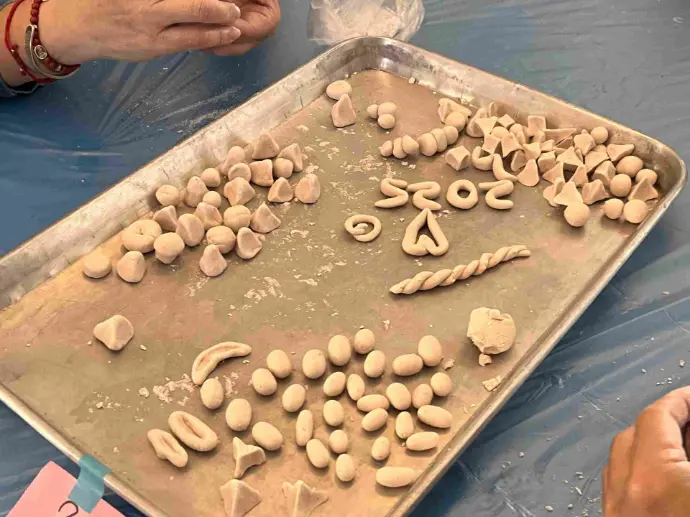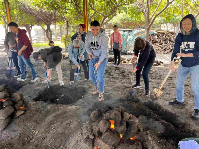 封窯之前,還有一道細緻的工序,是大家圍在一起學習如何正確地包裹食材。從濕潤報紙的厚度到各食材的捲法及封口順序等,地瓜、雞蛋與玉米在同仁及家人們的手中被嚴密地保護著。