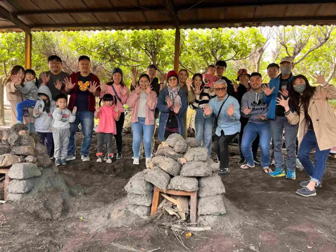 看著火光在窯口躍動,剛剛拿著鏟子流汗堆土的疲憊,彷彿都在這股暖意中消散了。孩子們在草地上奔跑,家人們的笑聲交織著柴火聲,在空氣中慢慢發酵。我們並肩坐著,一起等待著開窯的那一刻。