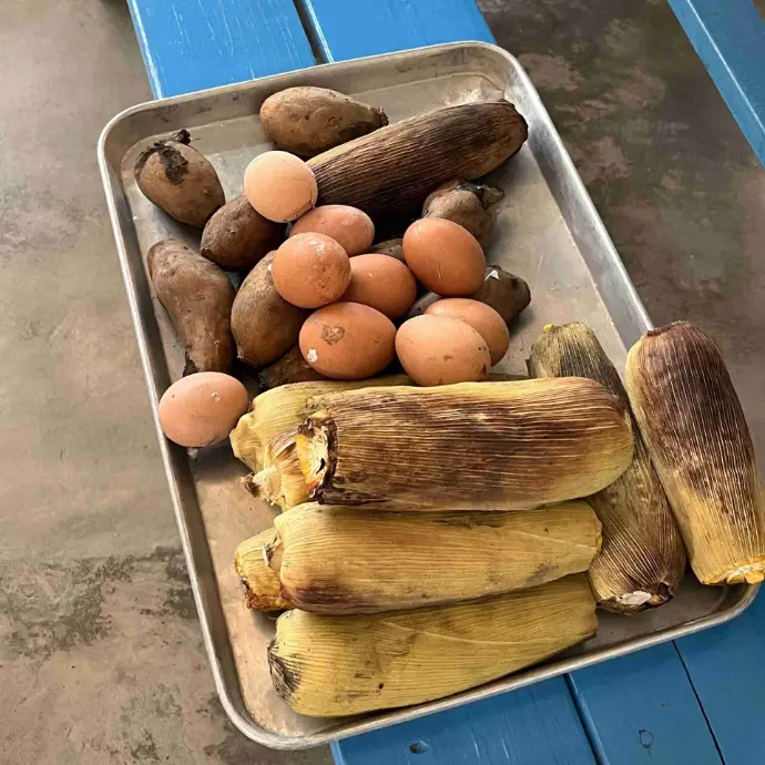 封窯之前,還有一道細緻的工序,是大家圍在一起學習如何正確地包裹食材。從濕潤報紙的厚度到各食材的捲法及封口順序等,地瓜、雞蛋與玉米在同仁及家人們的手中被嚴密地保護著。